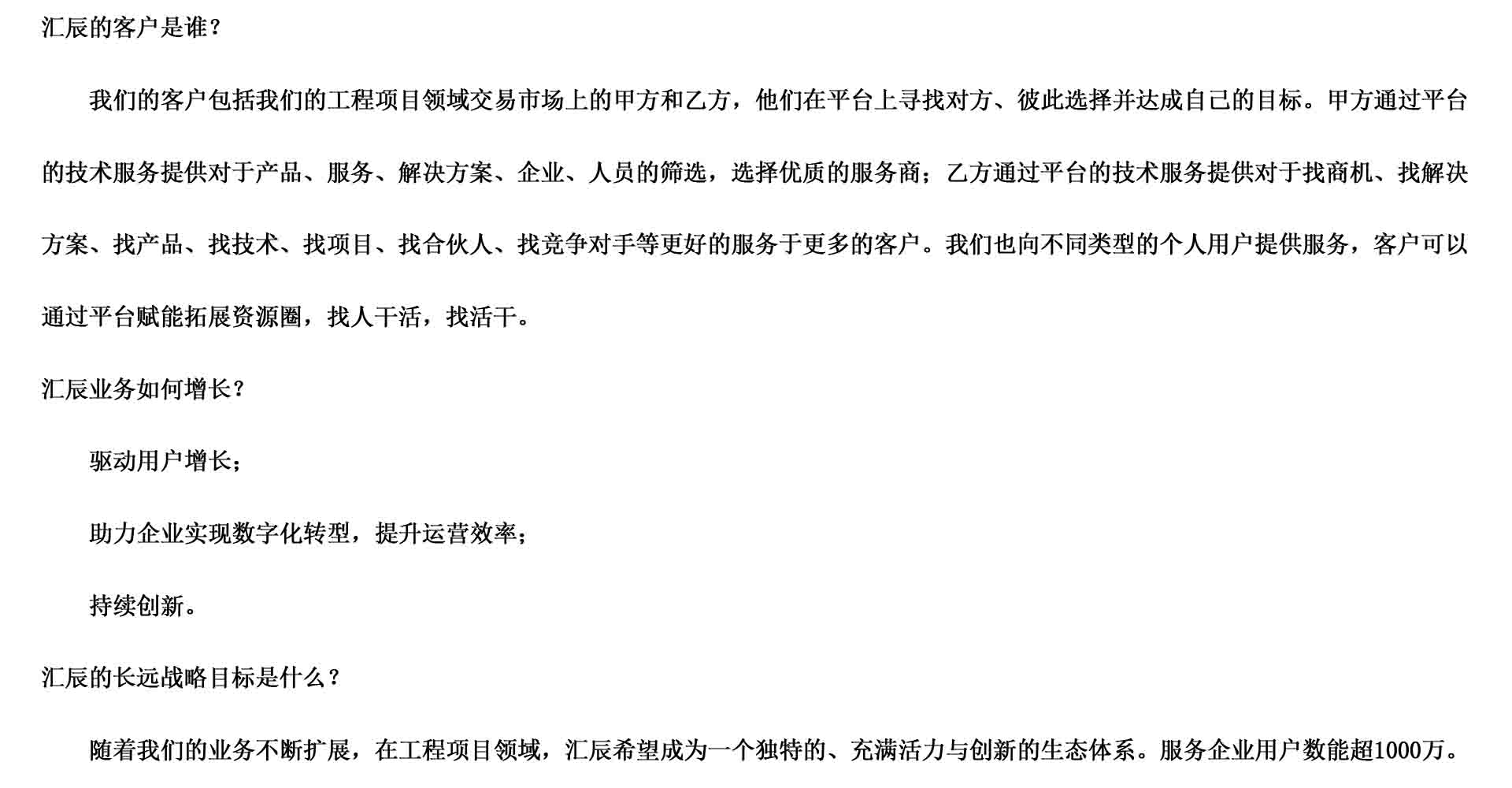 我们的客户包括我们的工程项目领域交易市场上的甲方和乙方,他们在平台上寻找对方、彼此选择并达成自己的目标。甲方通过平台的技术服务提供对于产品、服务、解决方案、企业、人员的筛选,选择优质的服务商;乙方通过平台的技术服务提供对于找商机、找解决方案、找产品、找技术、找项目、找合伙人、找竞争对手等更好的服务于更多的客户。我们也向不同类型的个人用户提供服务,客户可以通过平台赋能拓展资源圈,找人干活,找活干。